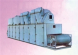 料斗中的物料由加料器均匀的铺在网带上,网带采用12-60目不锈钢丝网,由传动装置拖动在干燥机内移动。干燥段由若干单元组成,每一单元热风独立循环,其中部分尾气由专门排湿风机6排出。每一单元排出废气量均有调节阀门7控制。在上循环单元中,循环风机5与出来的风由侧面风道进入单元下腔,气流向上通过换热器4加热,并经分配器3分配后,成喷射流吹向网带,穿过物料后进入上腔。干燥过程是热气流穿过物料层,完成传质、传热的过程。上腔由风管与风机入口相连,大部分气体循环,一部分温度较低含湿